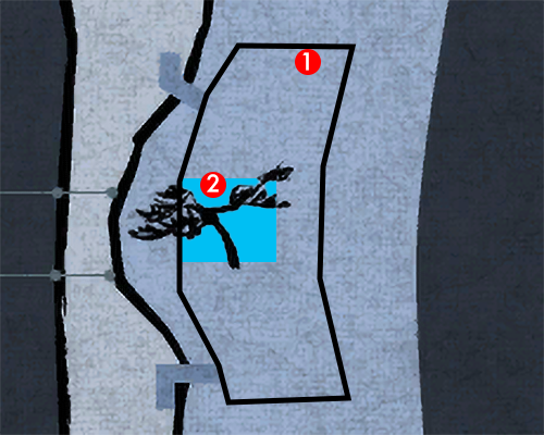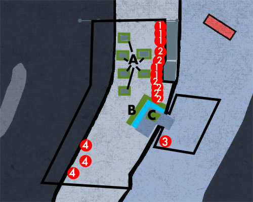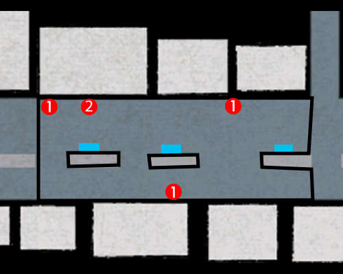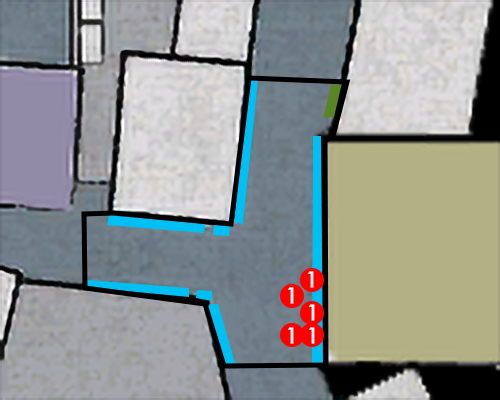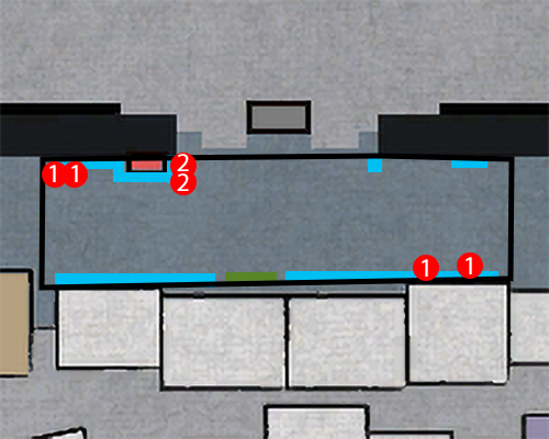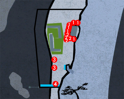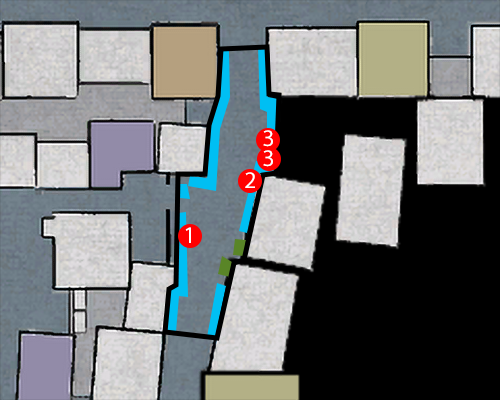 The numbered dots refer to weapons you can pick up. The blue areas show that a common environmental heat action can be performed there (e.g. a wall-related heat action). The green areas are for rare environmental heat actions (e.g. ones can that only be performed at a specific location).