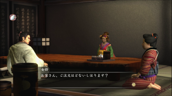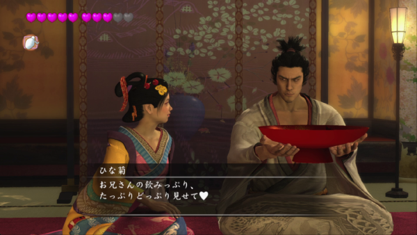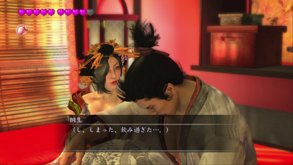 When you visit a yujo, you have the option to order food and drink. Depending on what you order, the yujo's heart gauge may go up or down (see the individual yujo sections on this page for full details). Also, if you drink any alcohol, Kiryu's intoxication level rises. If your intoxication level hits 950 (maximum intoxication is 999), which is a high level 5 intoxication, Kiryu gets too drunk and ends up getting kicked out of the brothel, immediately ending your session with the yujo. In addition, getting drunk and kicked out like this will lower the yujo's heart gauge. So, be careful not to drink too much when you visit them.