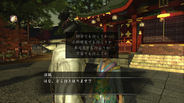 When you meet her, you then get a choice of where to take her and then choose food or a gift (depending on the location) with which to treat her. If you give her something she does not like, the date will be regarded as a failure. However, if you give her something she likes, the two of you return to the brothel and a new session starts with the yujo (but this time, the session fee is waived).