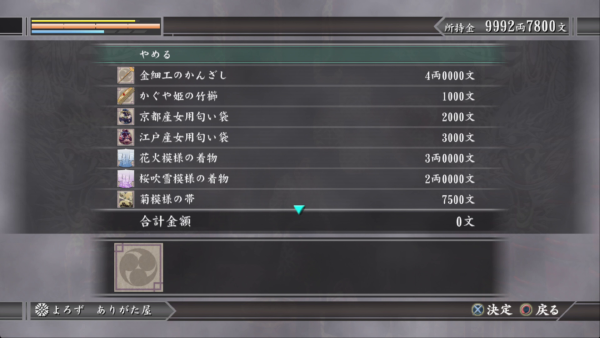 | Arigataya | +1 | Golden Hairpin / Fireworks Kimono / Flower-Pattern Obi / Portuguese Hand Mirror |