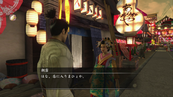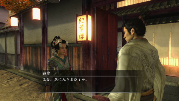 After ordering food and drink, you then have dialogue with the yujo. The yujo will say something, then you get a choice of 3 responses to what she said. Depending on your response, the yujo's heart gauge may go up or down (see the individual yujo sections on this page for full details). The heart gauge influences the number of dialogues you get in a yujo meeting. In the first meeting, you only get 2. After that, it goes up to 3 and opens up the ability to extend your stay. When you extend, you pay the yujo fee a second time and also get to order food and drink again.