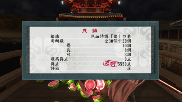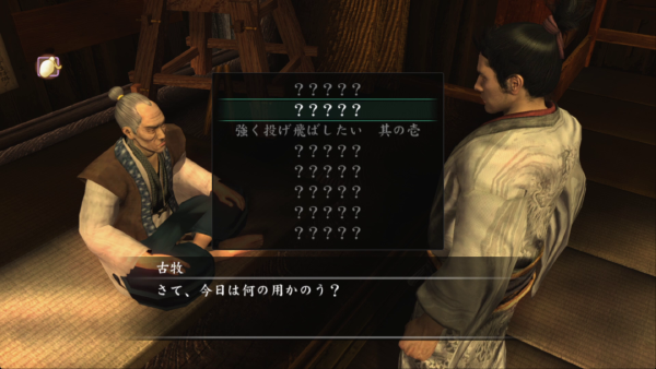 A mini-game style of training in which you slice melons to gain points. You encounter the trainer, En No Ozuma, in 8-8 during the main story, at Hozoin Temple. From 9-1 you will find him on River Road. You can do this training at any time of the day. This training rewards you with special heat actions that can only be used against bosses.